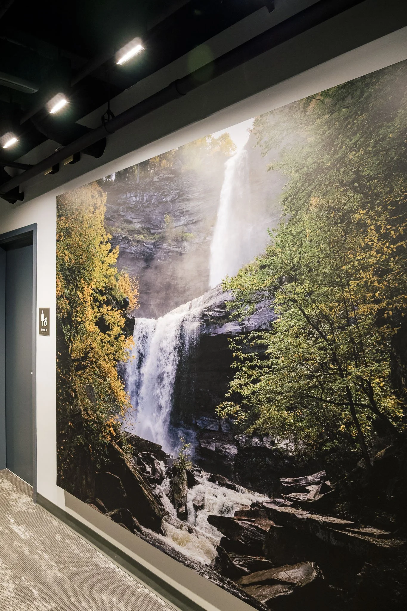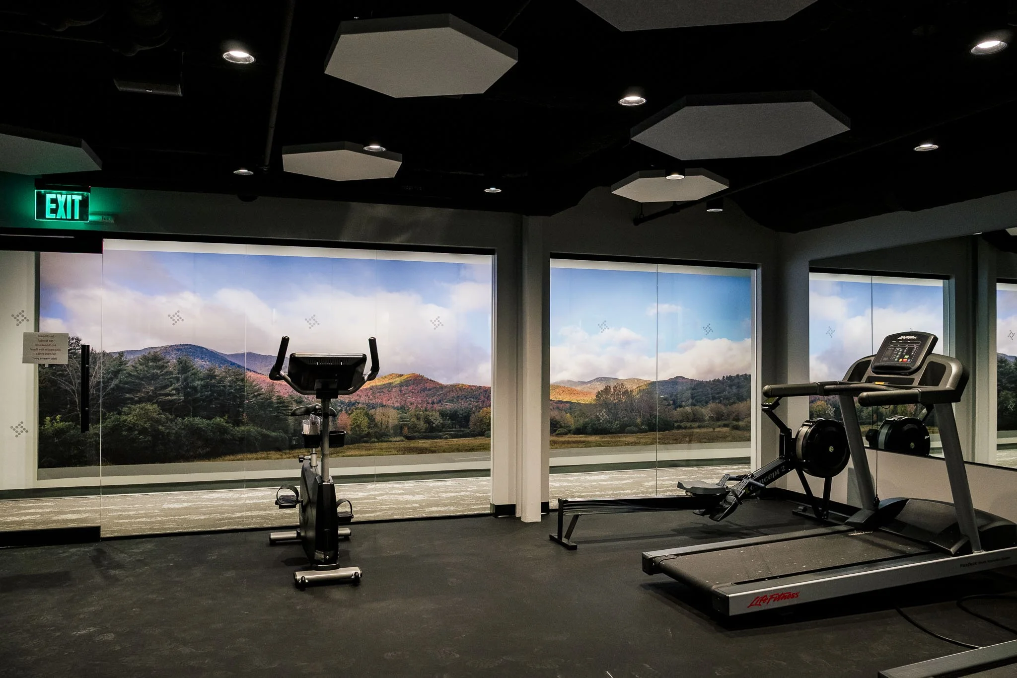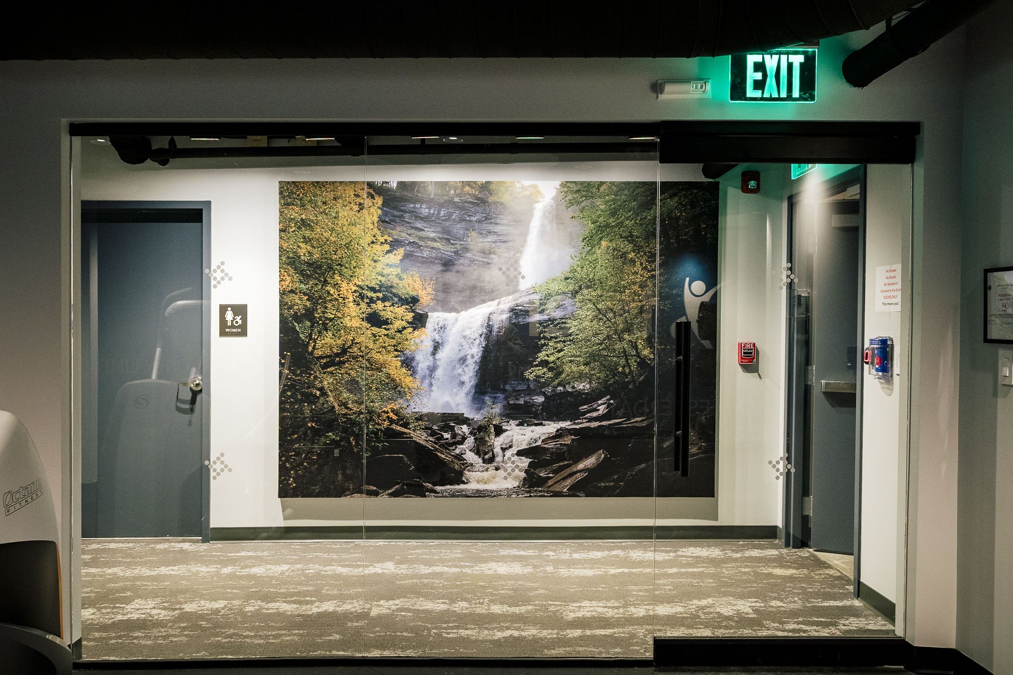 The images were printed and installed using vinyl wall wrap on drywall projections, rather than being framed. This gives a sense of separation between the images and the wall in the simplest way possible. Looking at the photos through the glass walls of the workout space, you get the same feeling as looking out a window at the natural world. There is a sense that the space carries outward beyond the photos, making the room feel bigger than it is.